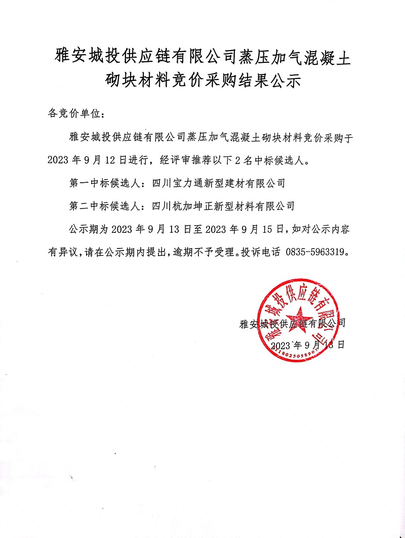 雅安城投供應(yīng)鏈有限公司蒸壓加氣混凝土砌塊材料競價采購結(jié)果公示