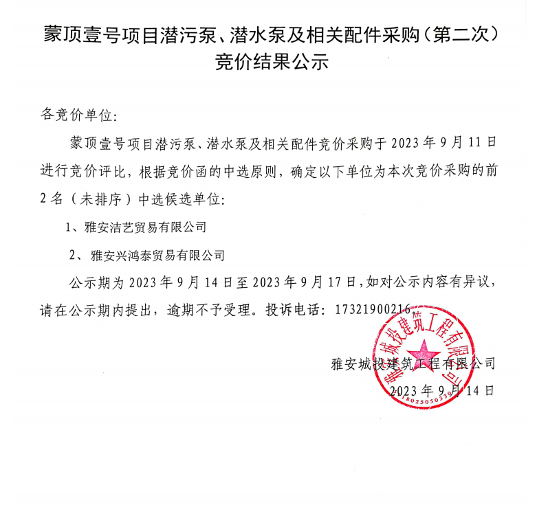 蒙頂壹號項(xiàng)目潛污泵、潛水泵及相關(guān)配件采購(第二次)競價結(jié)果公示