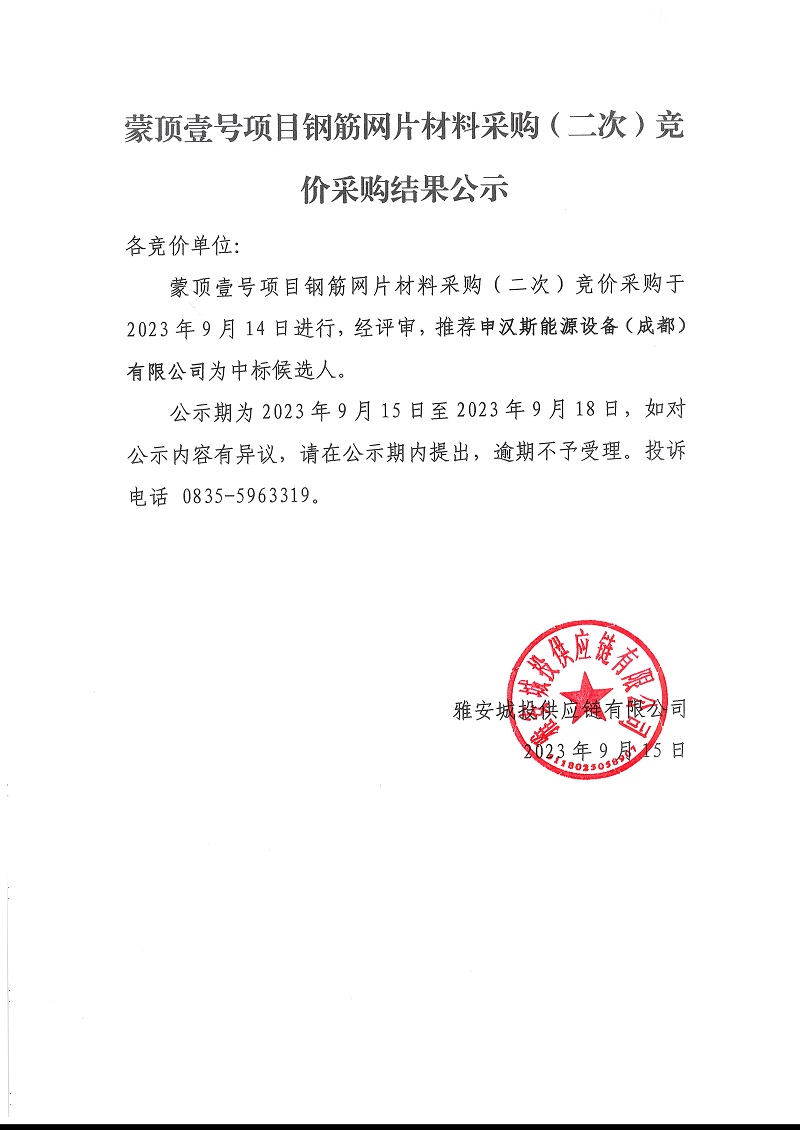 蒙頂壹號項目鋼筋網(wǎng)片材料采購(二次)競價采購結(jié)果公示