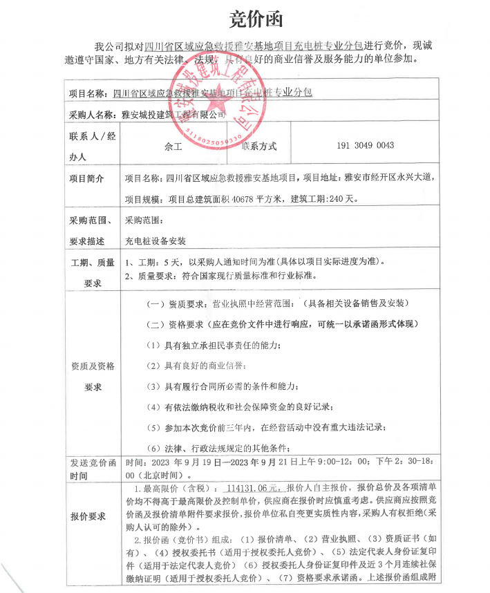 四川省區(qū)域應急救援雅安基地項目充電樁專業(yè)分包競價公告