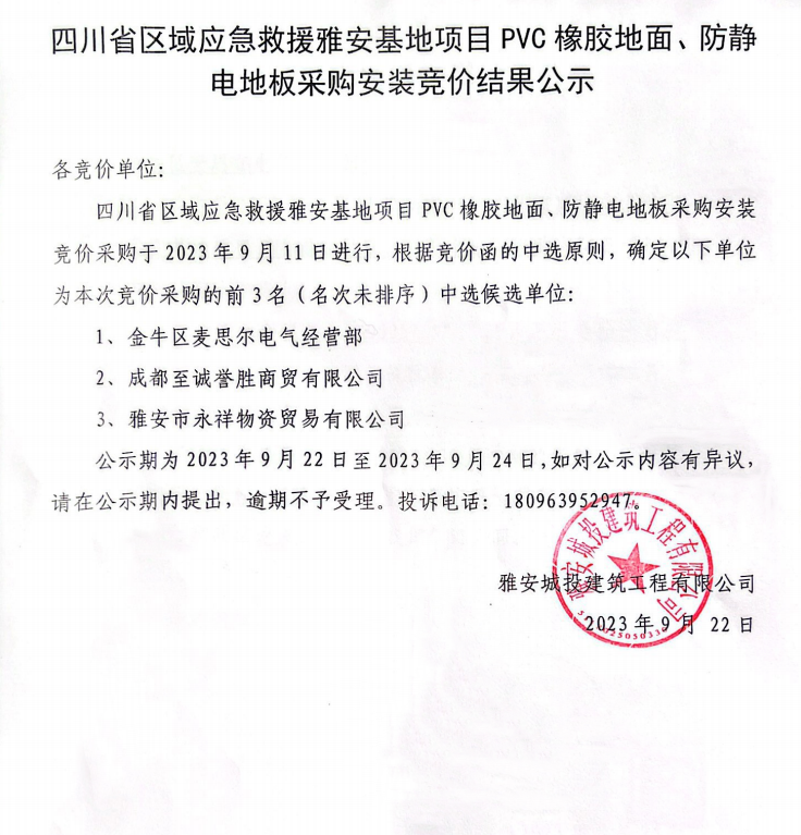 四川省區(qū)域應(yīng)急救援雅安基地項目PVC橡膠地面、防靜電地板采購安裝競價結(jié)果公示