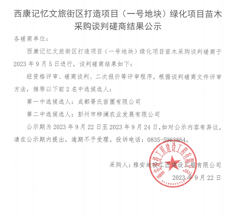 西康記憶文旅街區(qū)打造項(xiàng)目(一號地塊)綠化項(xiàng)目苗木采購談判磋商結(jié)果公示
