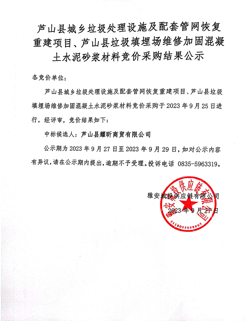 蘆山縣城鄉(xiāng)垃圾處理設(shè)施及配套管網(wǎng)恢復(fù)重建項(xiàng)目、蘆山縣垃圾填埋場(chǎng)維修加固混凝土水泥砂漿材料競(jìng)價(jià)采購(gòu)結(jié)果公示