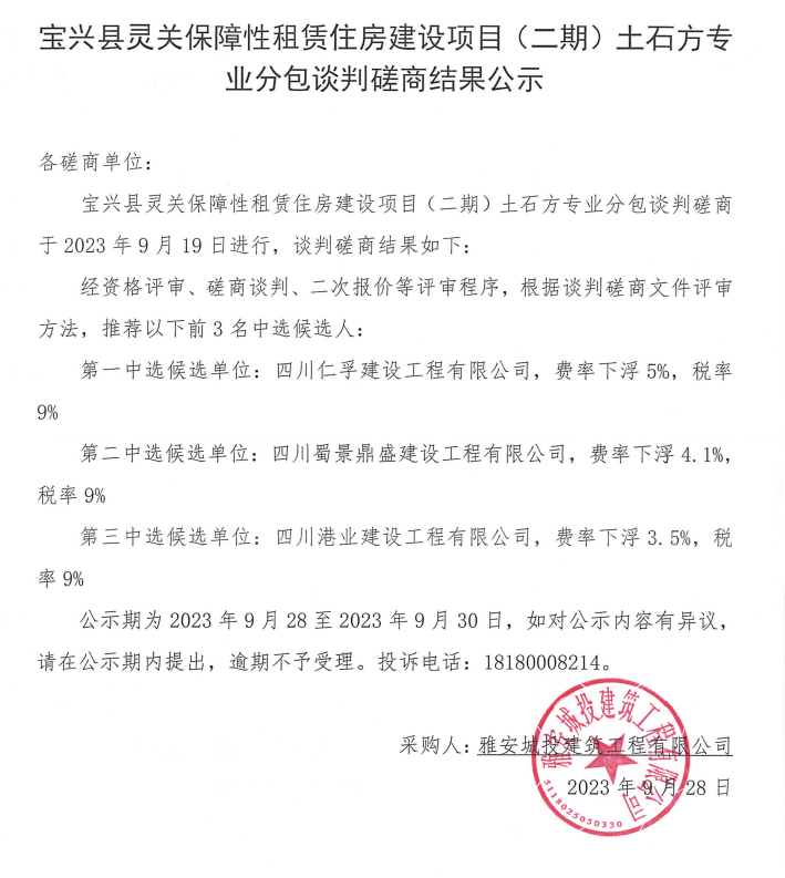 寶興縣靈關保障性租賃住房建設項目(二期)土石方專業(yè)分包談判磋商結果公示