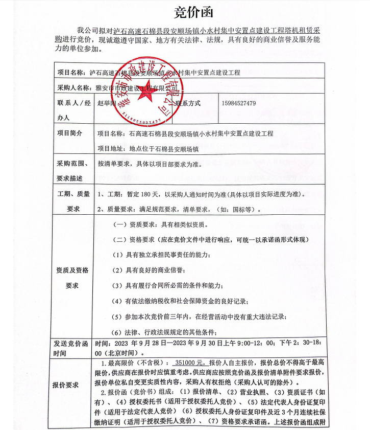 瀘石高速石棉縣段安順場鎮(zhèn)小水村集中安置點建設(shè)工程塔機租賃采購競價公告