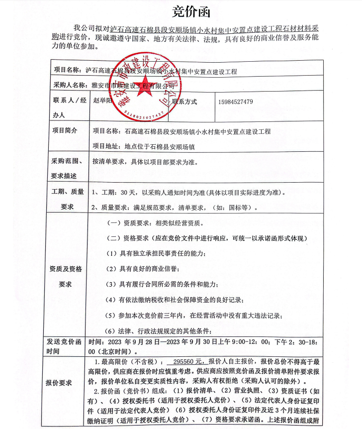 瀘石高速石棉縣段安順場小水村集中安置點建設工程石材材料采購競價公告