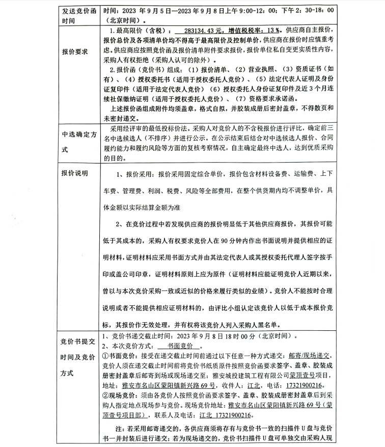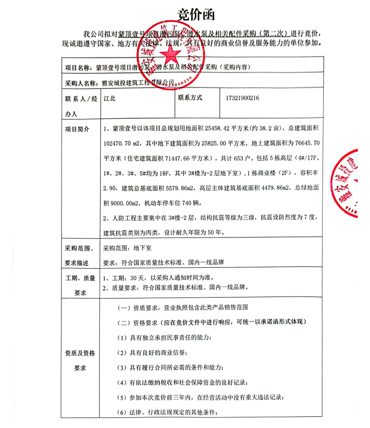 蒙頂壹號項(xiàng)目潛污泵、潛水泵及相關(guān)配件采購(第二次)競價(jià)公告