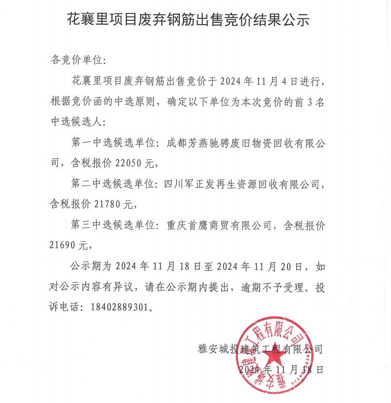 花襄·里項目廢棄鋼筋出售競價結(jié)果公示