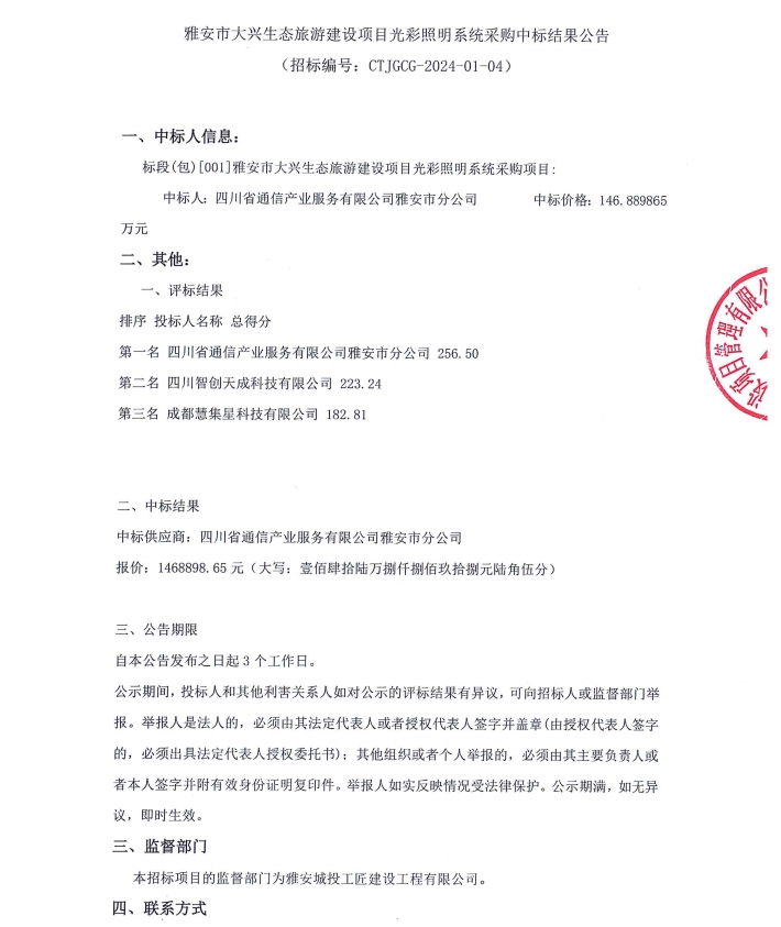 雅安市大興生態(tài)旅游建設(shè)項(xiàng)目光彩照明系統(tǒng)采購中標(biāo)結(jié)果公告