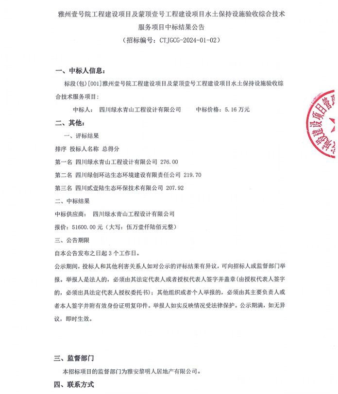 雅州壹號院工程建設(shè)項目及蒙頂壹號工程建設(shè)項目水土保持設(shè)施驗收綜合技術(shù)服務(wù)項目中標(biāo)結(jié)果公告