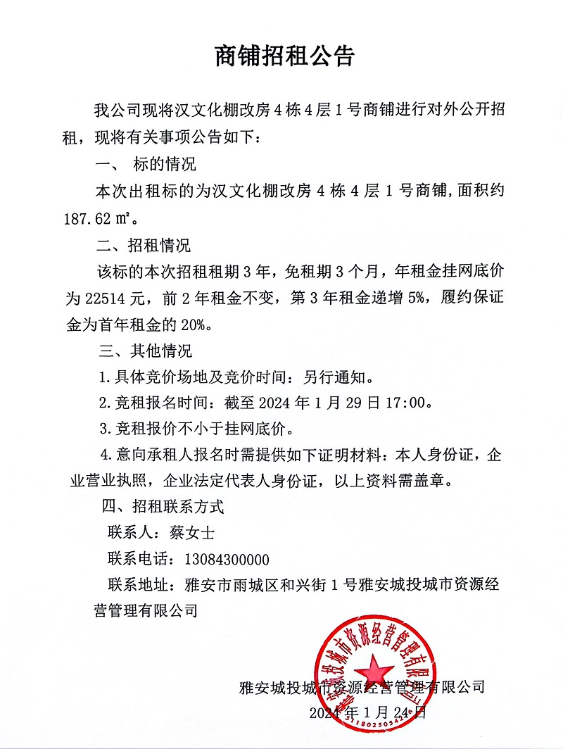 漢文化棚改房4棟4層1號(hào)商鋪招租公告