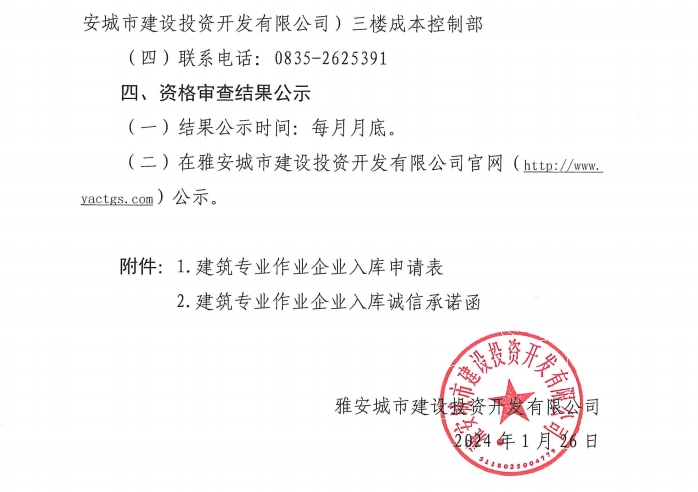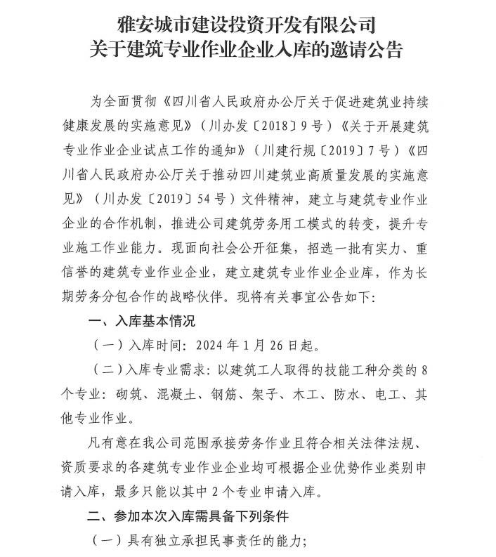 雅安城市建設(shè)投資開(kāi)發(fā)有限公司關(guān)于建筑專(zhuān)業(yè)作業(yè)企業(yè)入庫(kù)的邀請(qǐng)公告