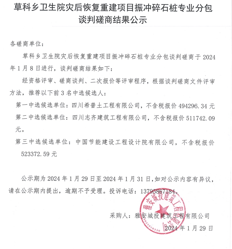 草科鄉(xiāng)衛(wèi)生院災(zāi)后恢復(fù)重建項(xiàng)目振沖碎石樁專(zhuān)業(yè)分包談判磋商結(jié)果公示