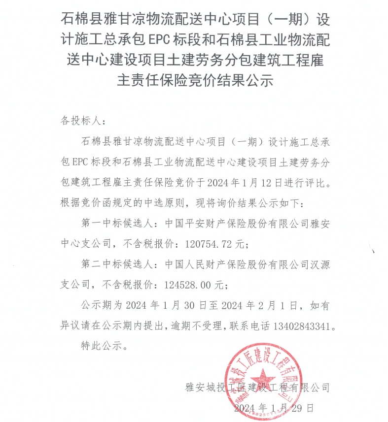石棉縣雅甘涼物流配送中心項目(一期)設(shè)計施工總承包EPC標(biāo)段和石棉縣工業(yè)物流配送中心建設(shè)項目土建勞務(wù)分包建筑工程雇主責(zé)任保險競價結(jié)果公示