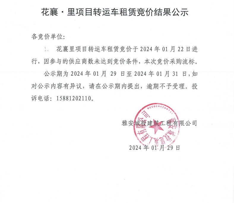 花襄·里項目轉(zhuǎn)運車租賃競價結(jié)果公示