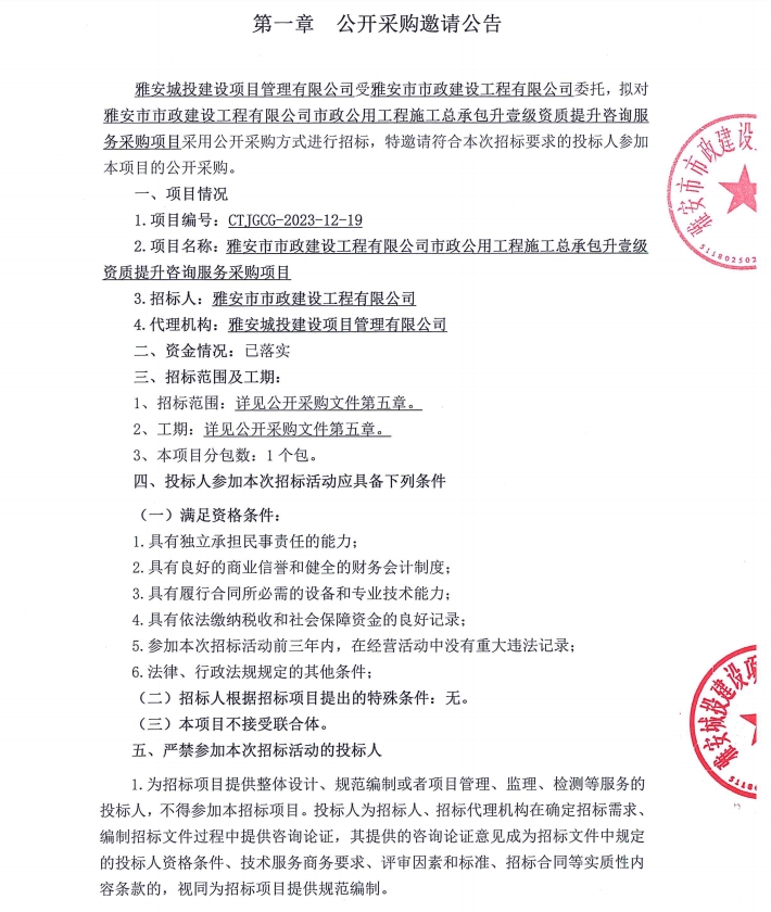 雅安市市政建設工程有限公司市政公用工程施工總承包升壹級資質(zhì)提升咨詢服務采購項目公開采購邀請公告