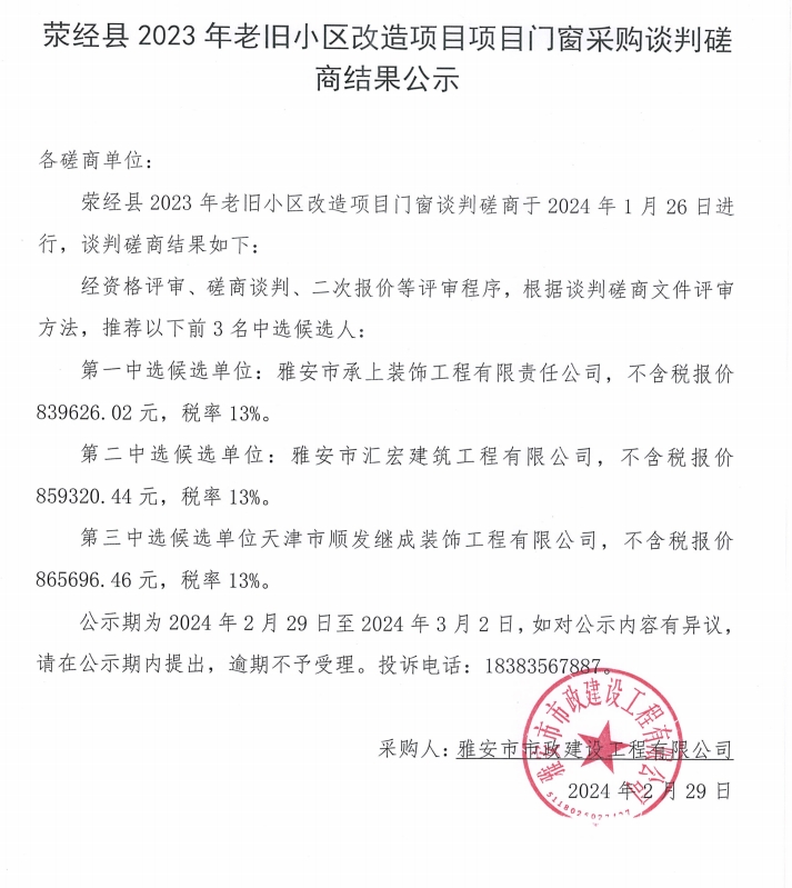 滎經(jīng)縣2023年老舊小區(qū)改造項(xiàng)目門窗采購(gòu)采購(gòu)談判磋商結(jié)果公示