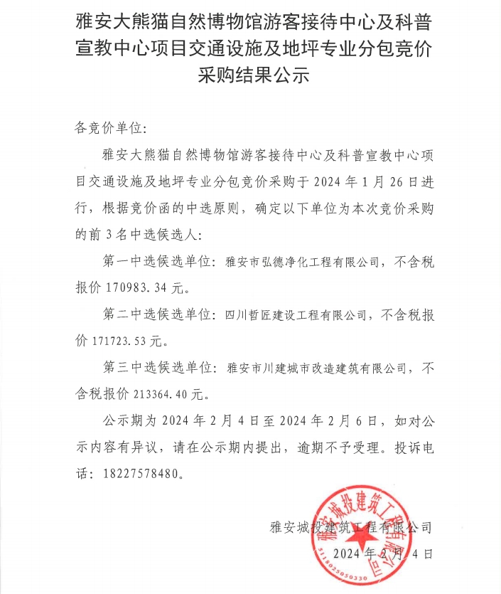 雅安市大熊貓自然博物館游客接待中心及科普宣教中心項(xiàng)目交通設(shè)施及地坪專業(yè)分包競價(jià)采購結(jié)果公示