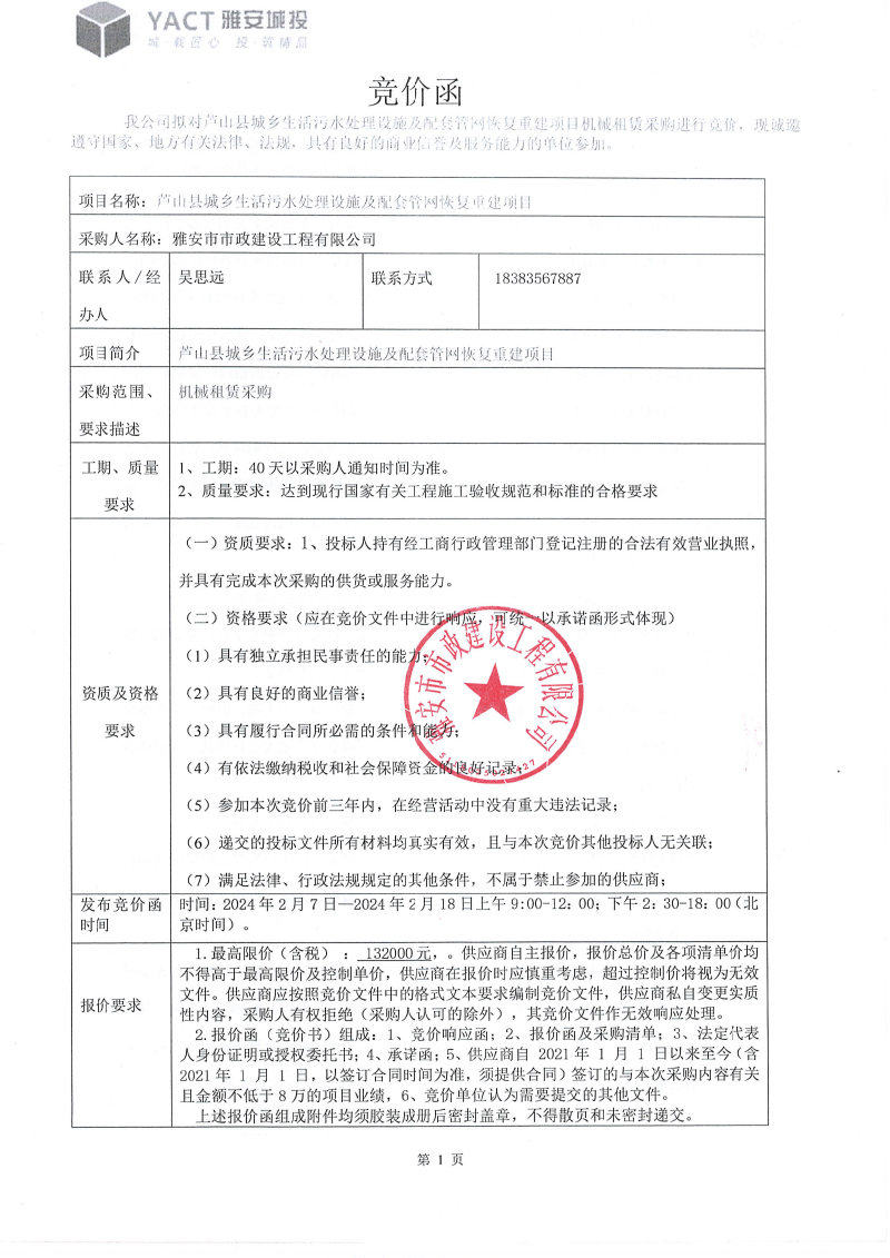 蘆山縣城鄉(xiāng)垃圾處理設(shè)施及配套管網(wǎng)恢復(fù)重建項目機(jī)械租賃采購競價函