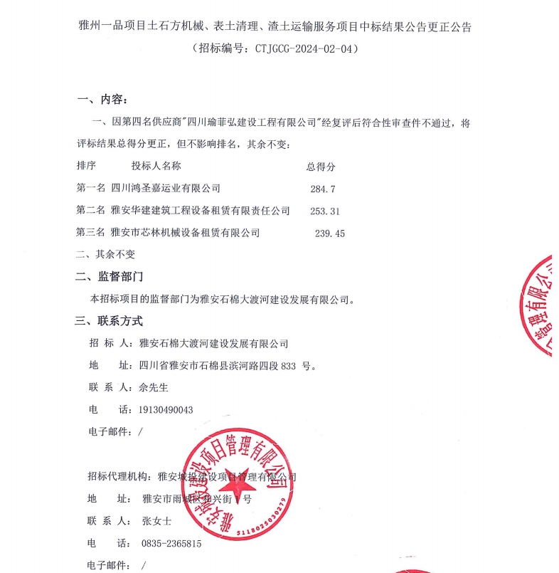 雅州一品項目土石方機械、表土清理、渣土運輸服務(wù)項目中標結(jié)果公告更正公告