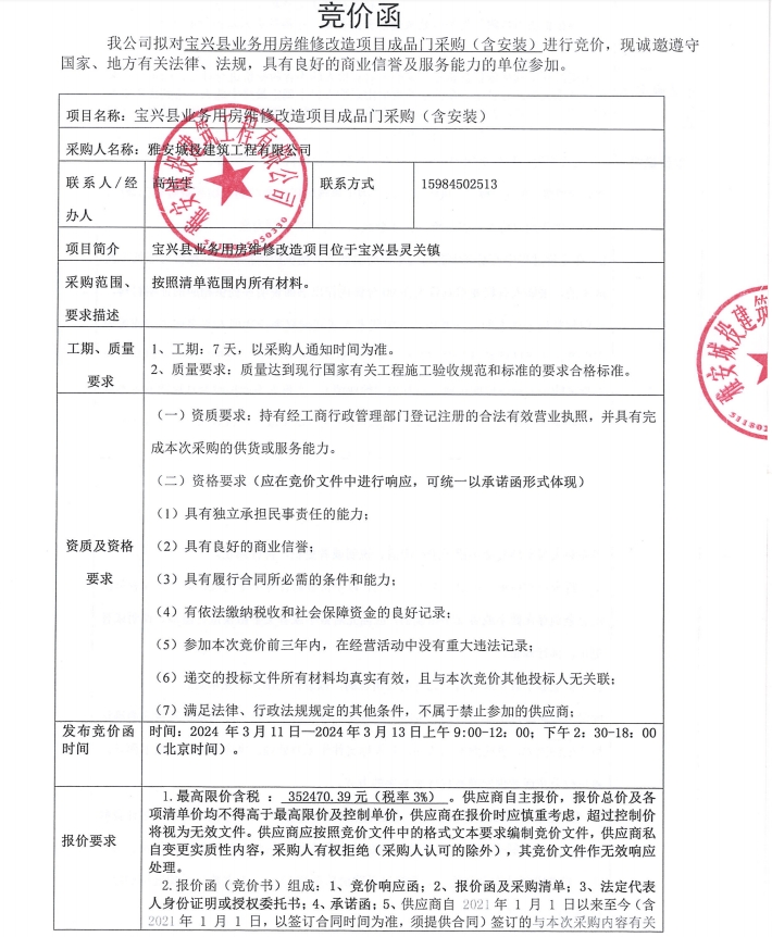 寶興縣業(yè)務(wù)用房維修改造項(xiàng)目成品門采購(gòu)(含安裝)競(jìng)價(jià)公告