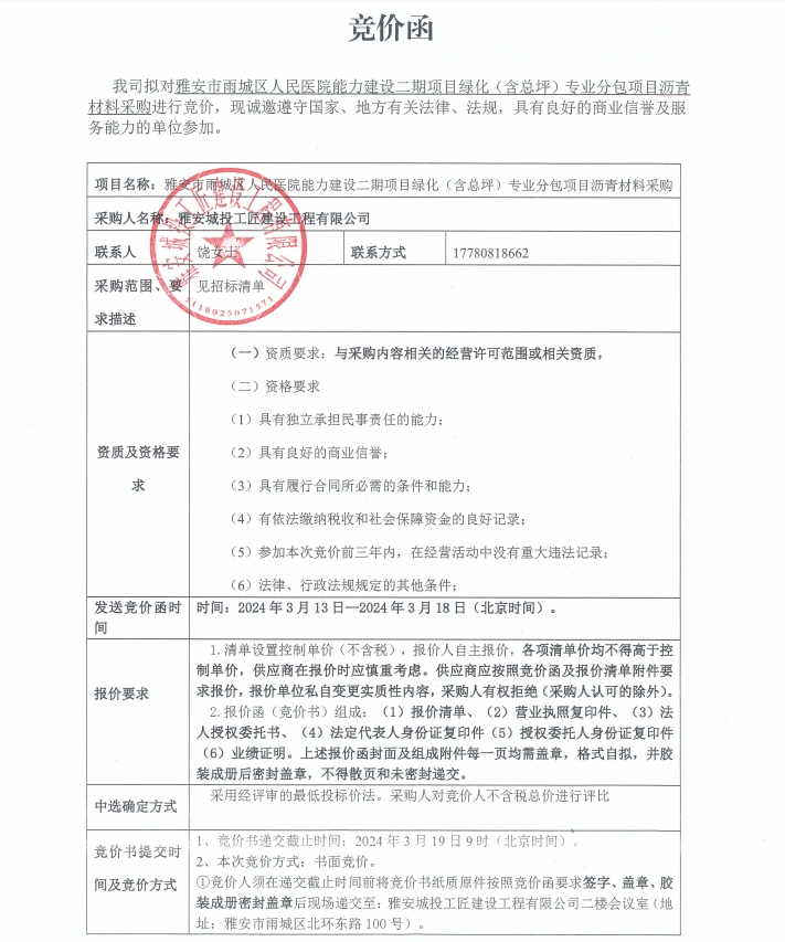 雅安市雨城區(qū)人民醫(yī)院能力建設(shè)二期項(xiàng)目綠化(含總坪)專業(yè)分包項(xiàng)目瀝青材料采購(gòu)競(jìng)價(jià)公告