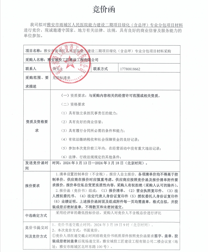 雅安市雨城區(qū)人民醫(yī)院能力建設(shè)二期項(xiàng)目綠化(含總坪)專業(yè)分包項(xiàng)目材料采購競價公告