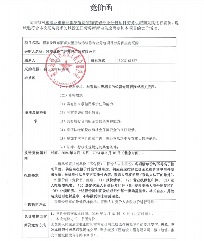 穆家及雅東麗都安置房裝飾裝修專業(yè)分包項目勞務(wù)供應(yīng)商采購競價公告