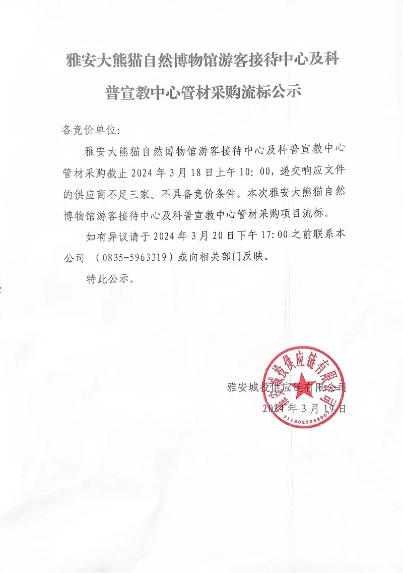 雅安大熊貓自然博物館游客接待中心及科普宣教中心管材采購(gòu)流標(biāo)公示