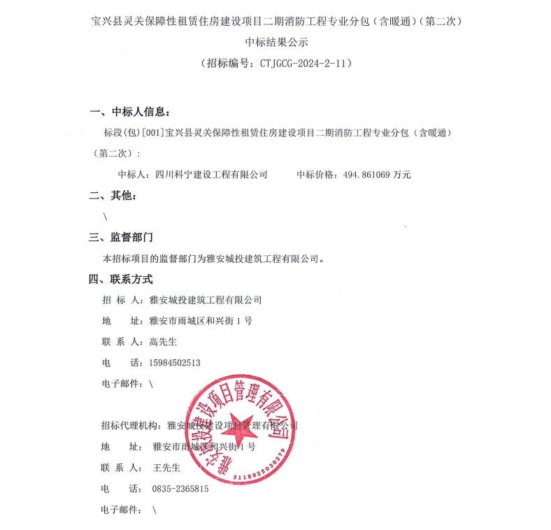 寶興縣靈關(guān)保障性租賃住房建設(shè)項(xiàng)目二期消防工程專業(yè)分包(含暖通)(第二次)中標(biāo)結(jié)果公示