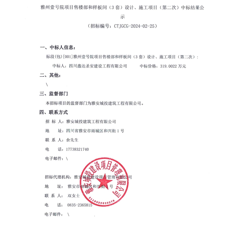 雅州壹號院項目售樓部和樣板間(3套)設(shè)計、施工項目(第二次)中標(biāo)結(jié)果公示