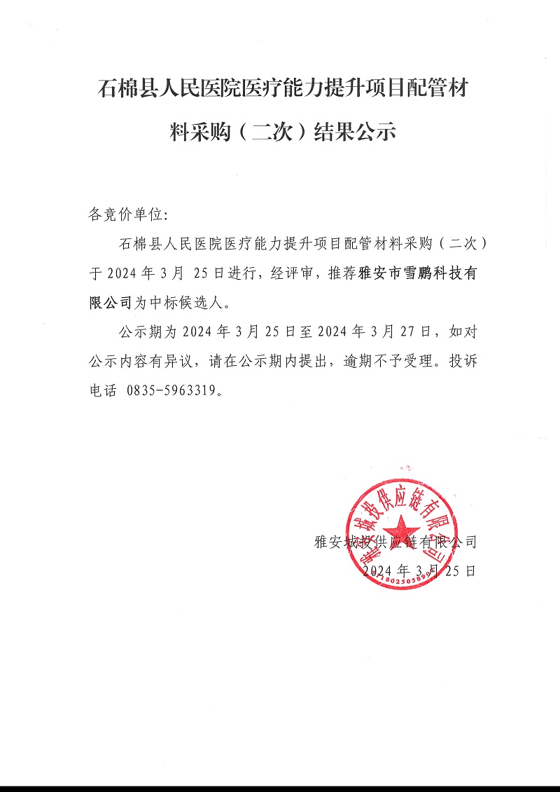 石棉縣人民醫(yī)院醫(yī)療能力提升項目配管材料采購(二次)結果公示