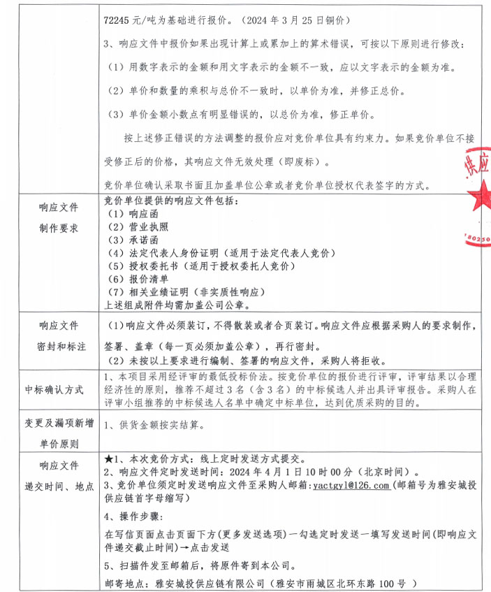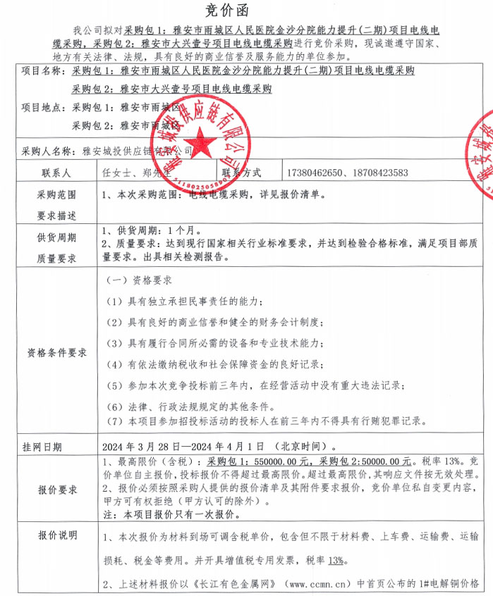 雅安城投供應(yīng)鏈有限公司電線電纜采購競價公告