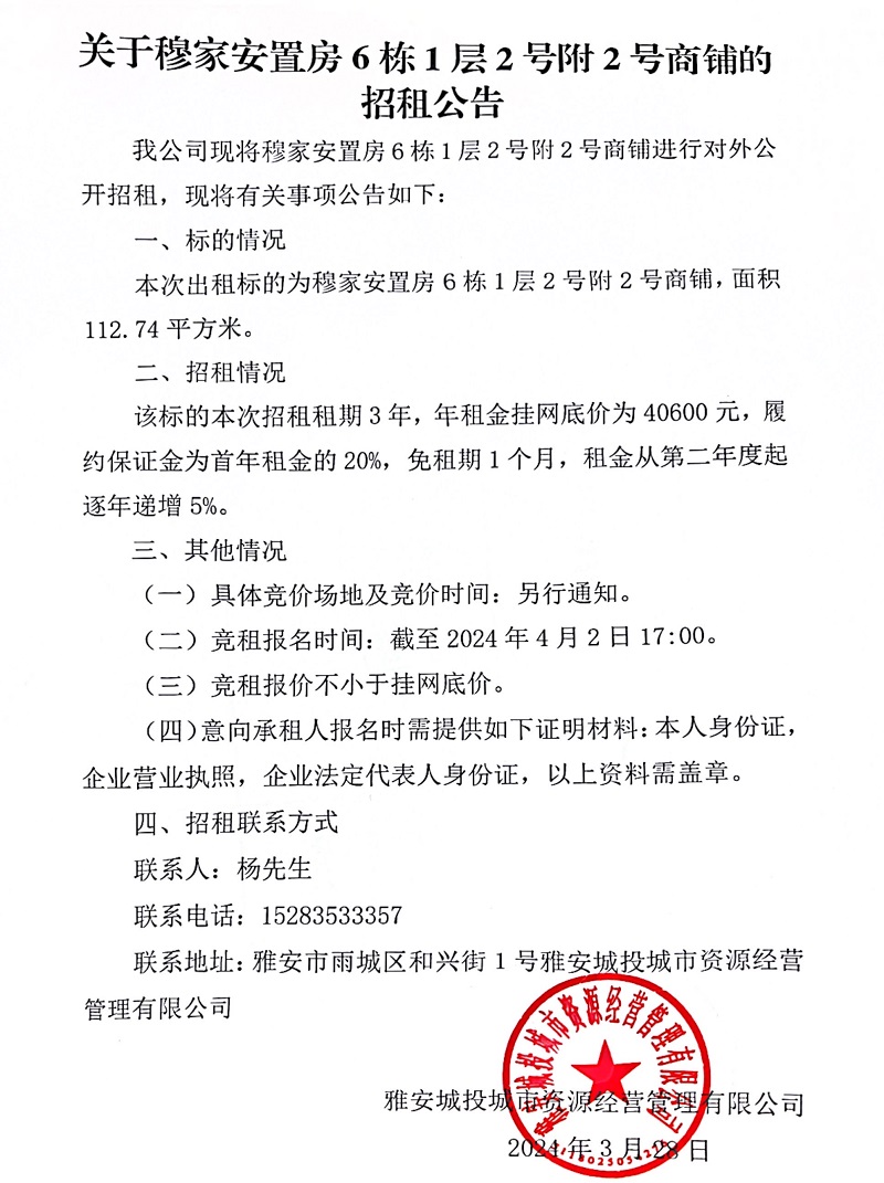 關(guān)于穆家安置房6棟1層2號(hào)附2號(hào)商鋪的招租公告
