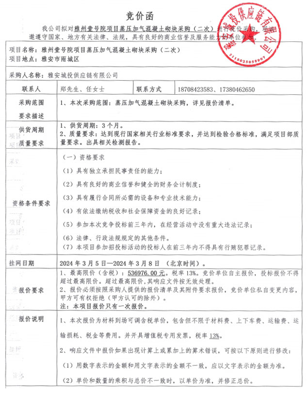 雅州壹號(hào)院項(xiàng)目蒸壓加氣混凝土砌塊采購(第二次)競(jìng)價(jià)公告