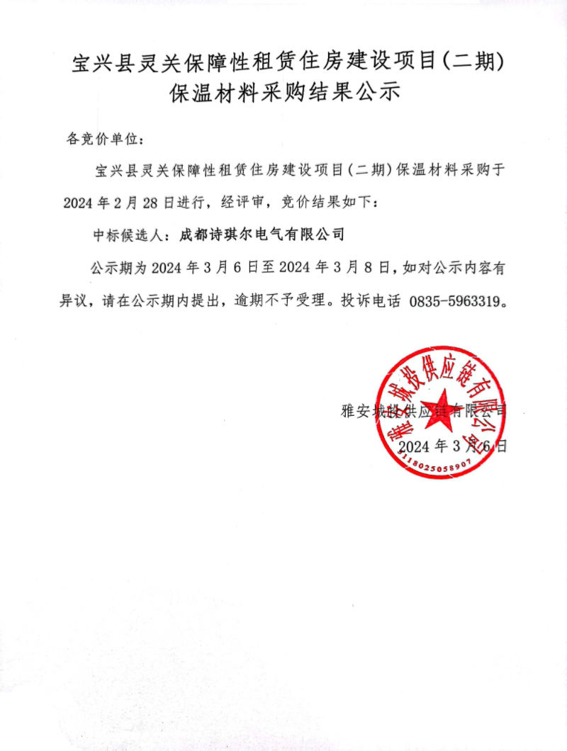 寶興縣靈關(guān)保障性租賃建設(shè)項(xiàng)目(二期)保溫材料采購(gòu)結(jié)果公示