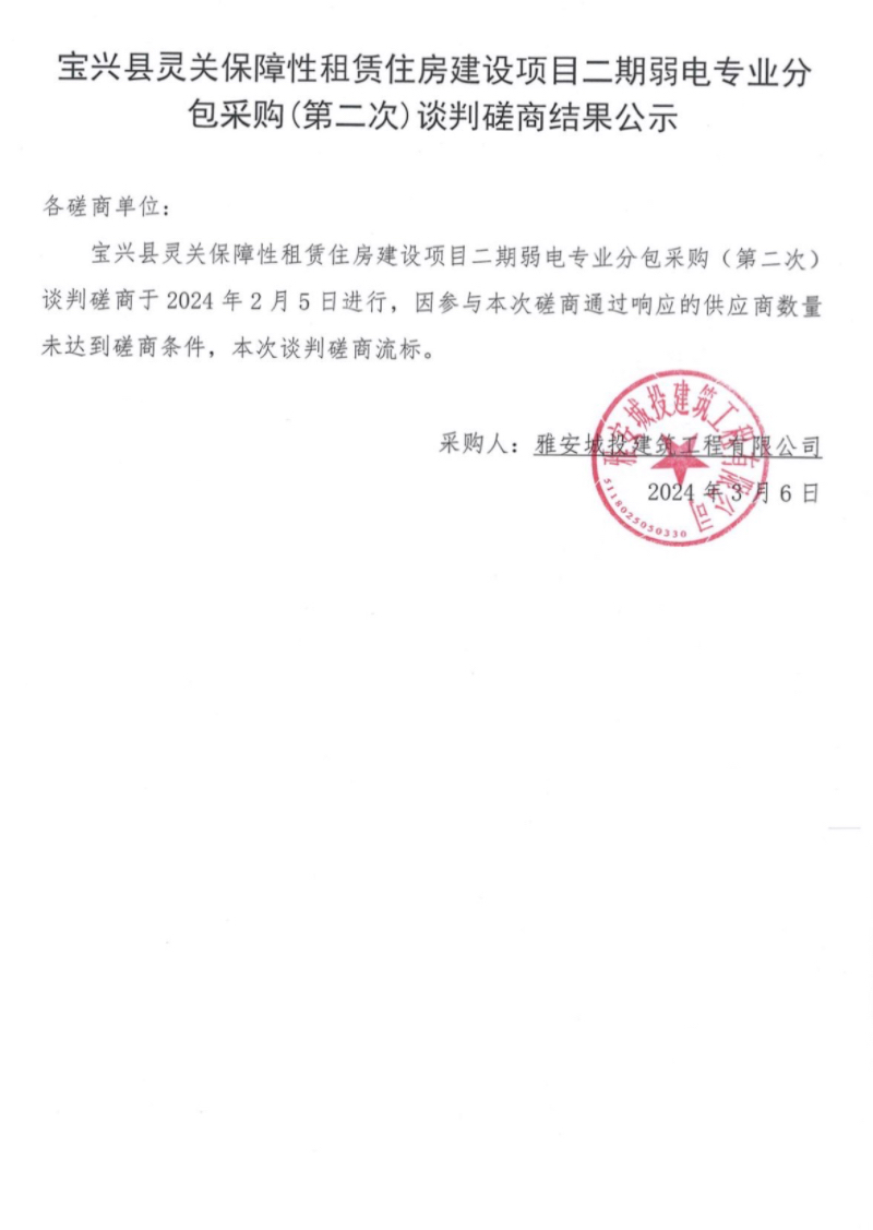 寶興縣靈關鎮(zhèn)保障性租賃住房建設項目二期弱電專業(yè)分包采購(第二次)談判磋商結(jié)果公示