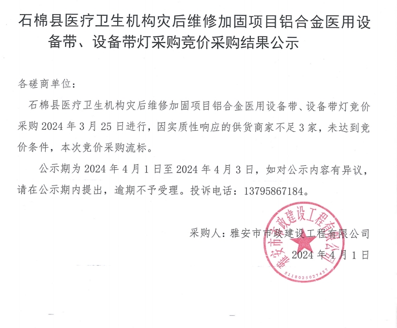石棉縣醫(yī)療衛(wèi)生機構(gòu)災后維修加固項目鋁合金醫(yī)用設備帶、設備帶燈采購競價采購結(jié)果公示
