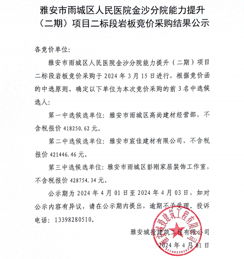 雅安市雨城區(qū)人民醫(yī)院金沙分院能力提升(二期)項(xiàng)目二標(biāo)段巖板競價采購結(jié)果公示