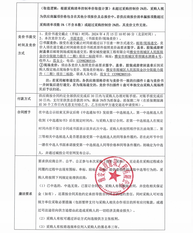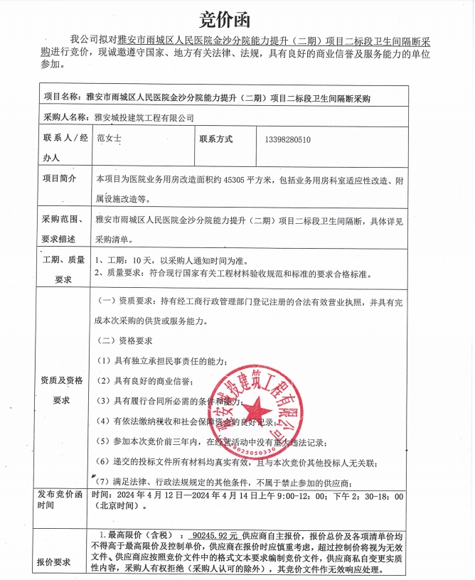 雅安市雨城區(qū)人民醫(yī)院金沙分院能力提升(二期)項(xiàng)目二標(biāo)段衛(wèi)生間隔斷采購競(jìng)價(jià)公告