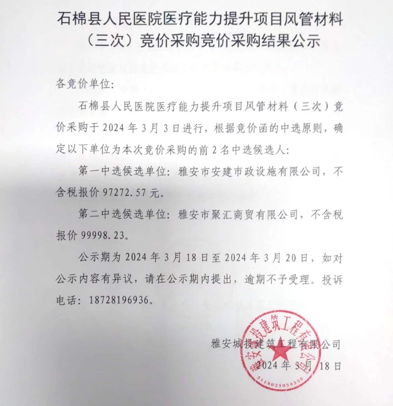 石棉縣人民醫(yī)院醫(yī)療能力提升項(xiàng)目風(fēng)管材料(三次)競(jìng)價(jià)采購競(jìng)價(jià)采購結(jié)果公示