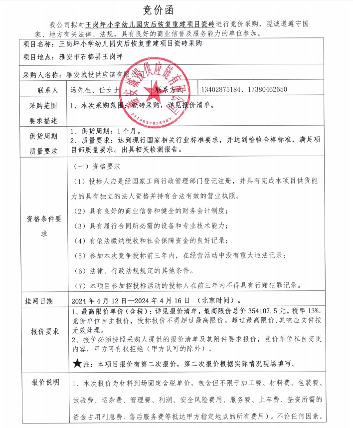 王崗坪小學幼兒園災(zāi)后恢復重建項目瓷磚競價公告