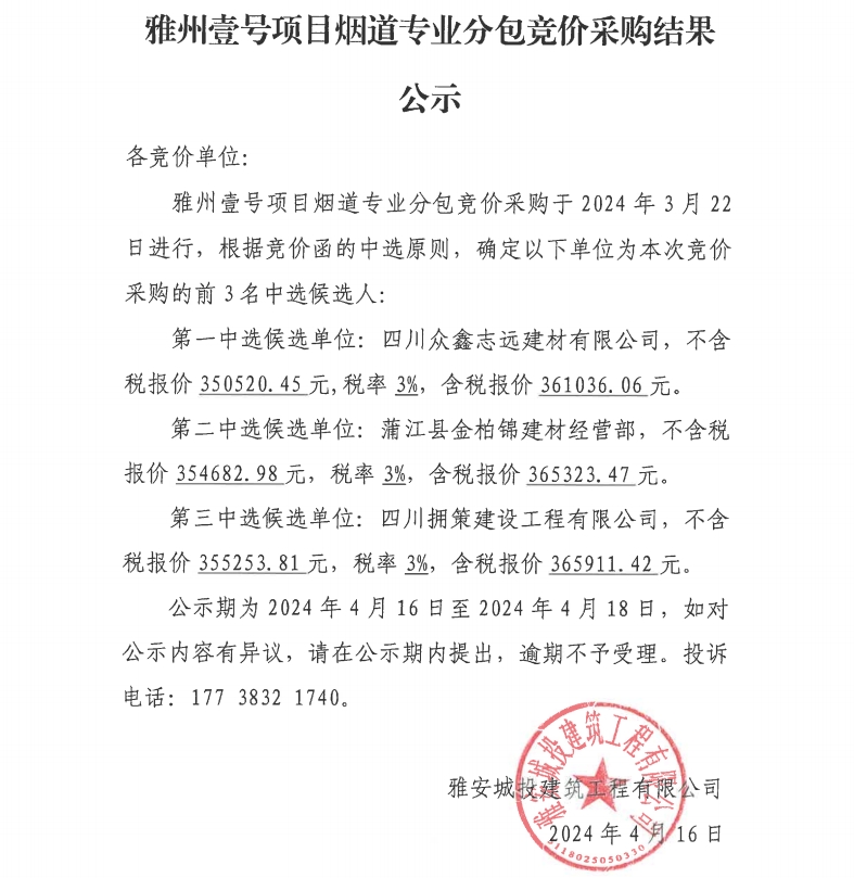 雅州壹號項(xiàng)目煙道專業(yè)分包競價采購結(jié)果公示