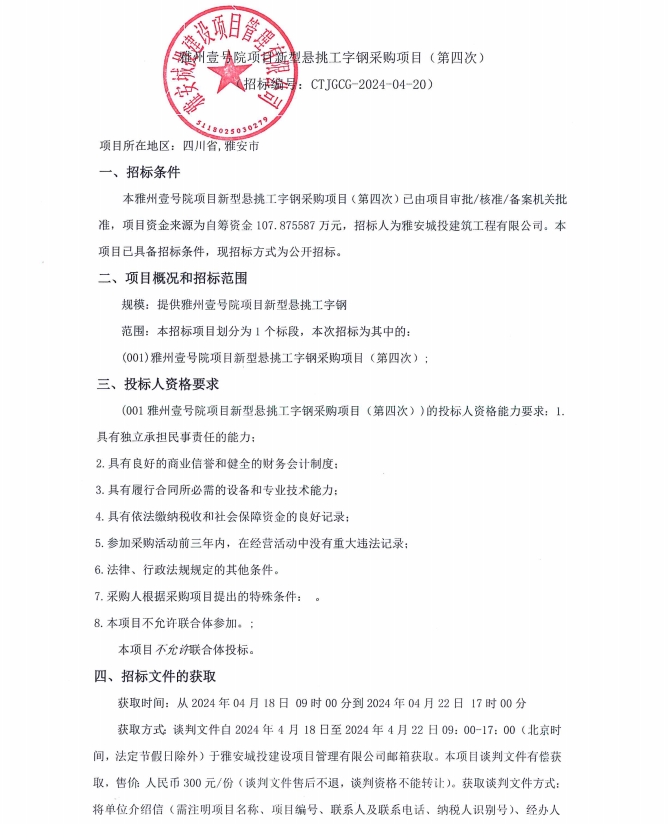 雅州壹號(hào)院項(xiàng)目新型懸挑工字鋼采購(gòu)項(xiàng)目(第四次)公告