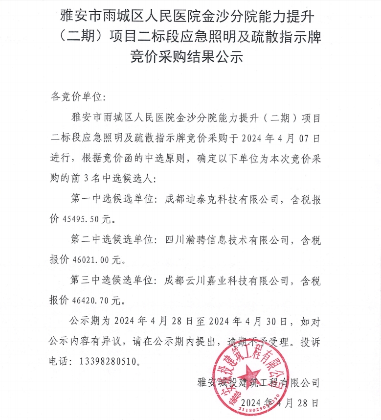 雅安市雨城區(qū)人民醫(yī)院金沙分院能力提升(二期)項(xiàng)目二標(biāo)段應(yīng)急照明及疏散指示牌競(jìng)價(jià)采購(gòu)結(jié)果公示