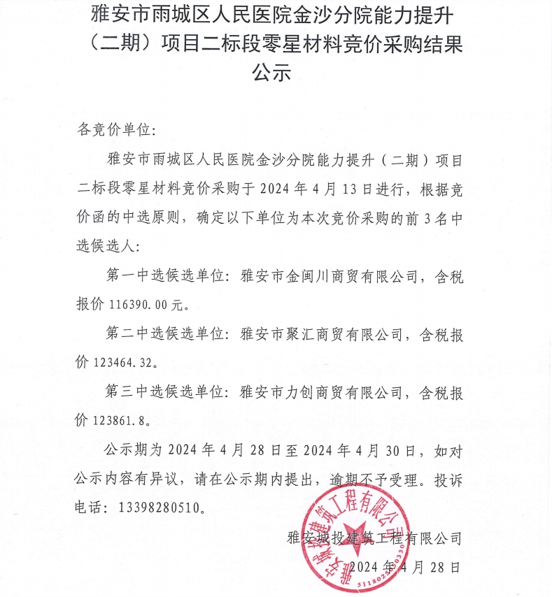 雅安市雨城區(qū)人民醫(yī)院金沙分院能力提升(二期)項(xiàng)目二標(biāo)段零星材料競(jìng)價(jià)采購結(jié)果公示