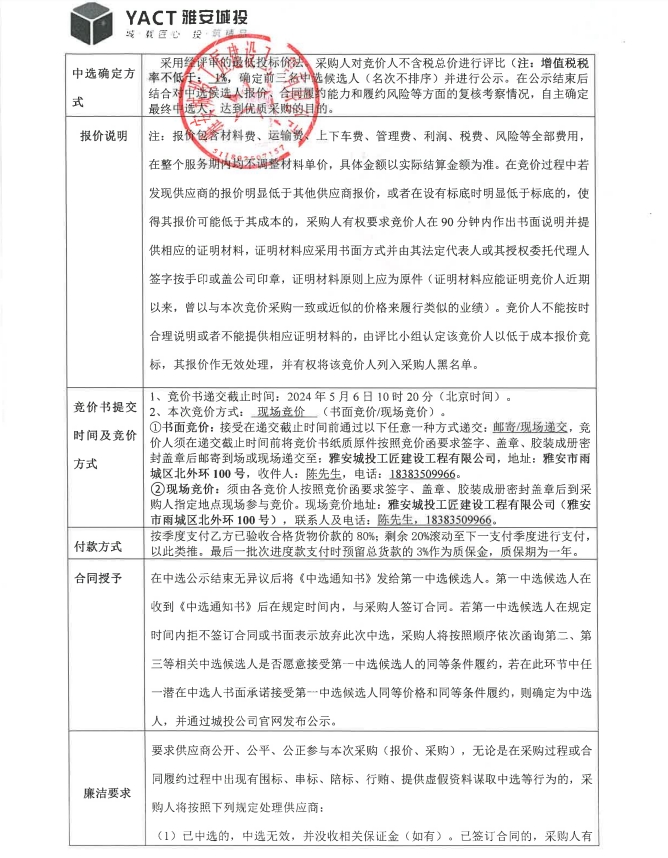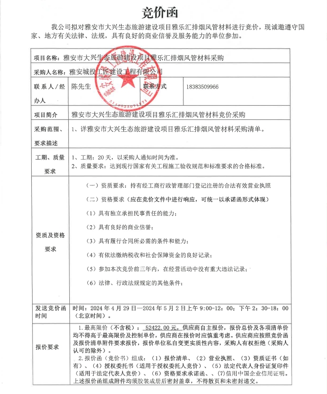雅安市大興生態(tài)旅游建設(shè)項目雅樂匯排煙風管材料采購競價公告