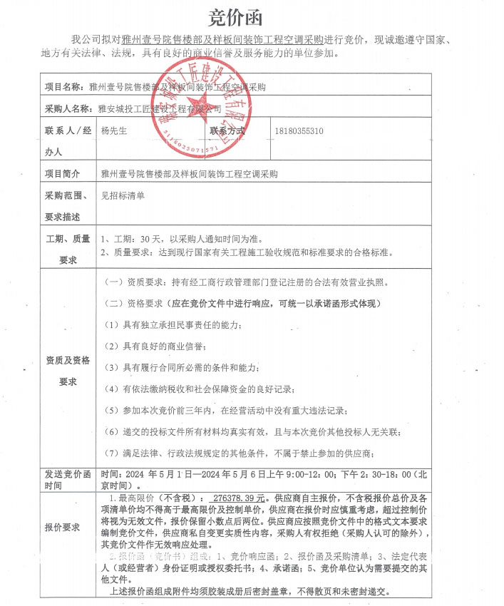 競價函-空調(diào)采購-雅州壹號院售樓部及樣板間