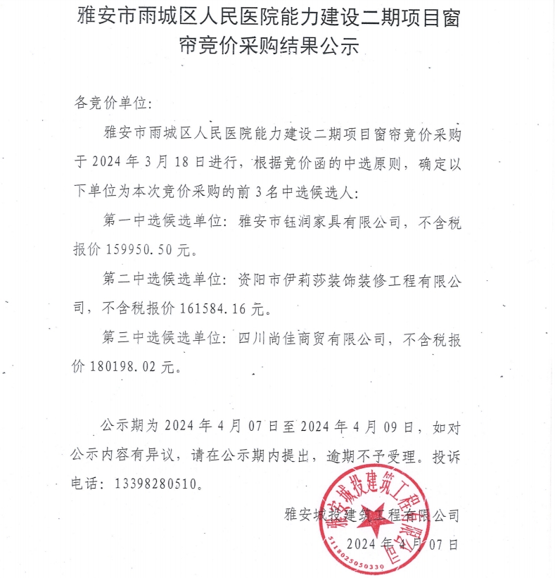 雅安市雨城區(qū)人民醫(yī)院能力建設(shè)二期項目窗簾競價采購結(jié)果公示