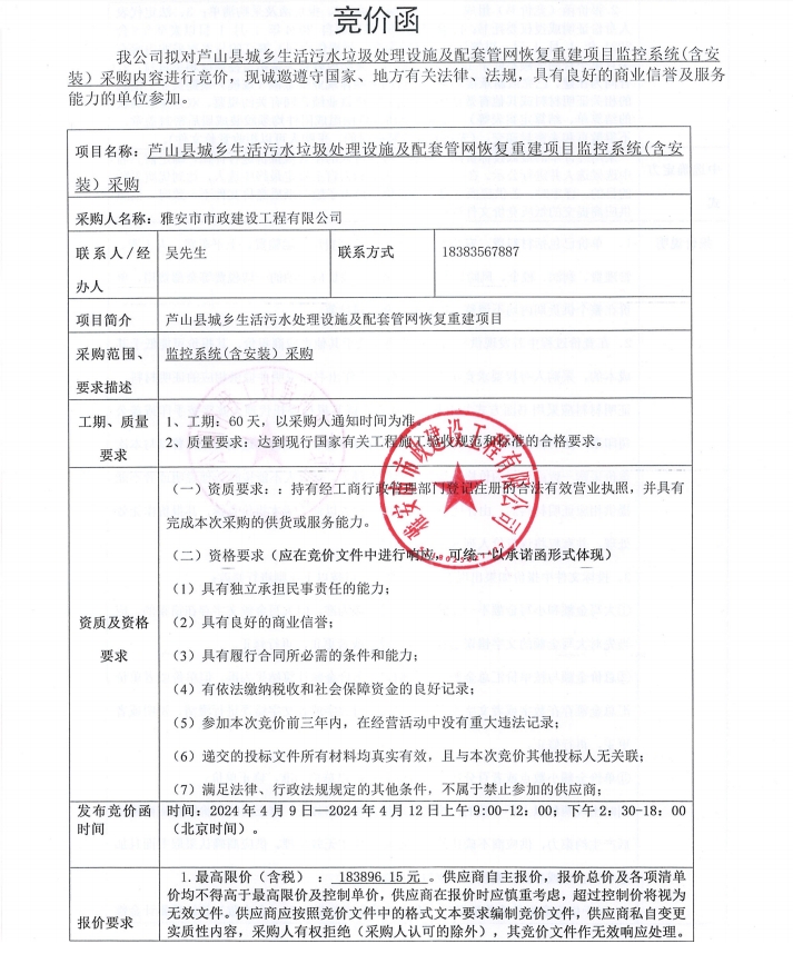 蘆山縣城鄉(xiāng)生活污水垃圾處理設(shè)施及配套管網(wǎng)恢復(fù)重建項(xiàng)目監(jiān)控系統(tǒng)(含安裝)采購內(nèi)容競價公告
